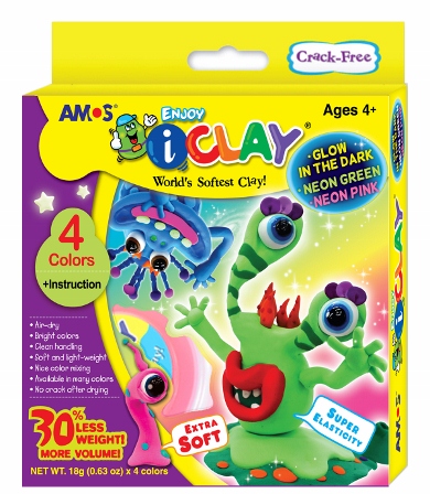 הגוונים באריזה: 1 זוהר בחושך 1 כחול 1 ירוק זרחני 1 ורוד זרחני מכירים את החימר הקל של AMOS? נפלא ליצירת קישוטים, אביזרים, צעצועים, כדורים קופצים ועוד יצירות כיד הדמיון. מתייבש באוויר לפני שהחימר מתייבש לחלוטין ניתן להחיות אותו ע"י ריסוס מעט מים ולישה. גמיש במיוחד צבעים חיים אינו מלכלך את הידיים רך וקל משקל ערבוב צבעים בקלות אינו נסדק לאחר הייבוש