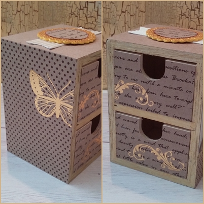 מגירות עץ קטנות צופו בנייר ועוטרו במדבקות גירוד מוזהבות: