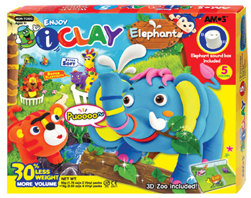* 2 חבילות חימר קל (50 גר‘ כל אחת) * 4 חבילות חימר קל (15 גר‘ כל אחת) * קופסת צליל המשמיעה קולות של תרועת פיל * רקע תלת מימדי של גן חיות מקרטון קשיח * כלים לפיסול * חוברת הוראות מפורטת