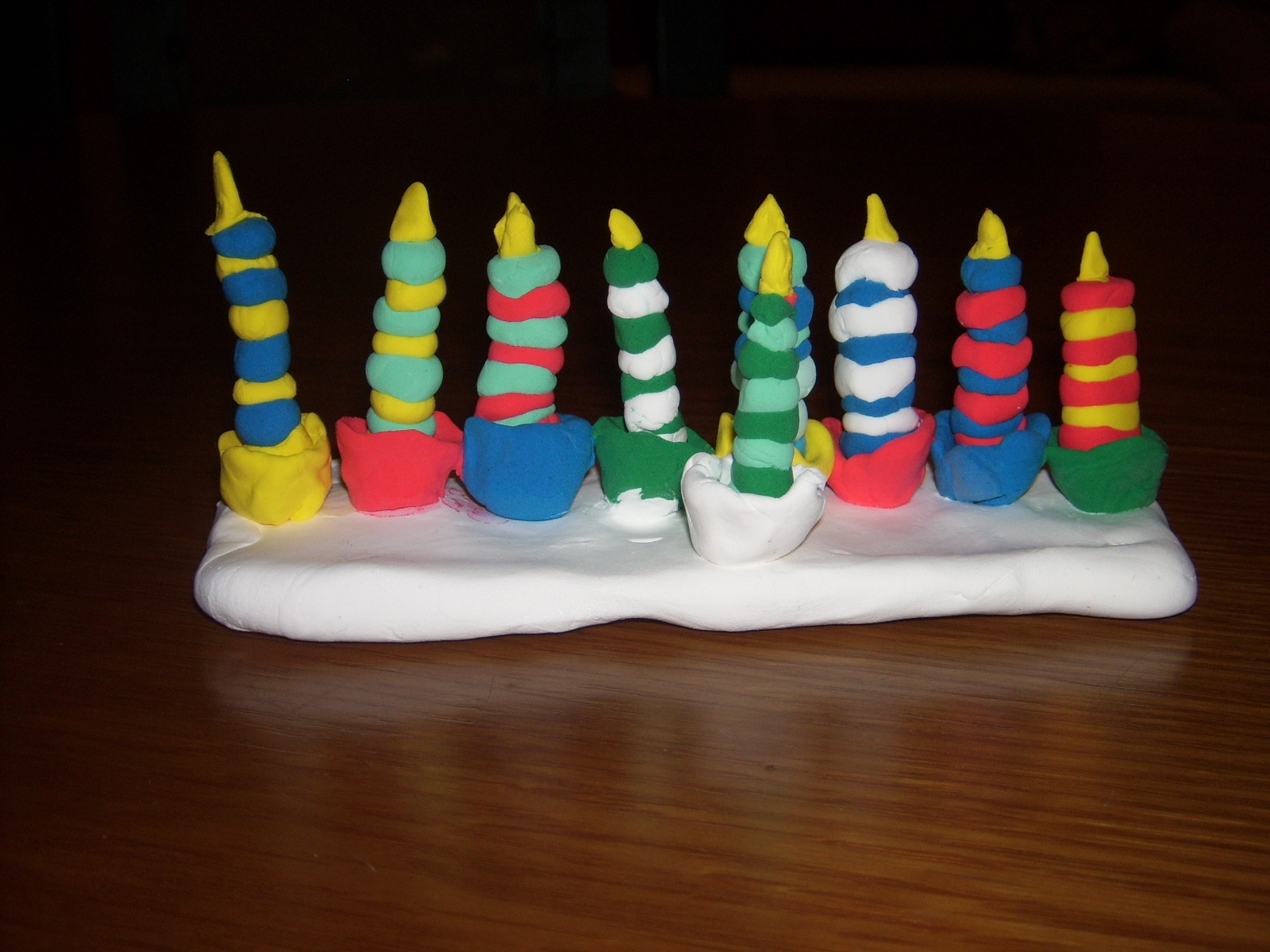 הכנת בסיס מלבני בצבע לבן, כוסיות לנרות ונרות המורכבים מכדורים שהוצמדו זה לזה.